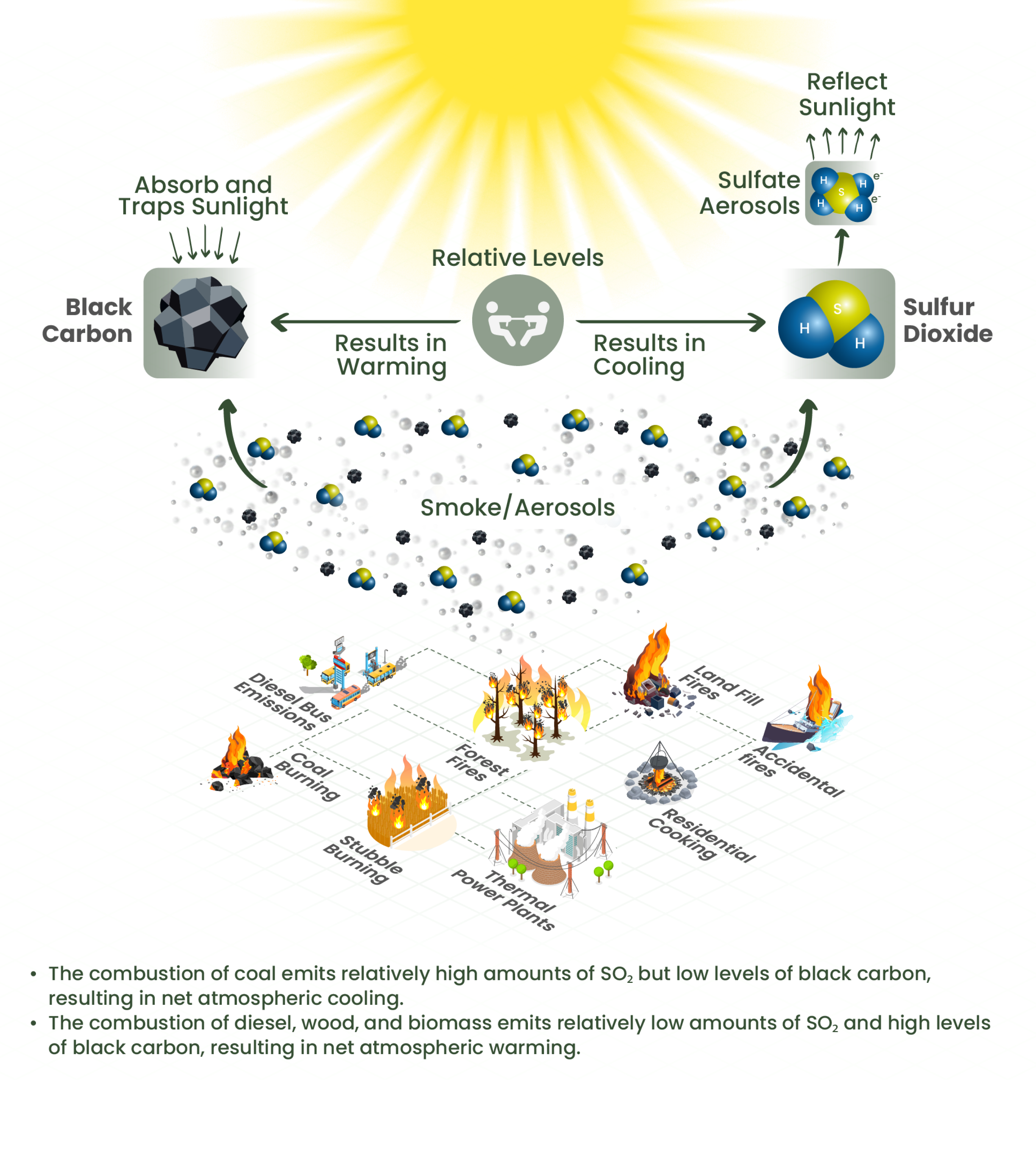 Mitigating Short-Lived Climate Pollutants (SLCPs) such as black carbon and methane provides immediate benefits for climate and air quality. Many sources of these pollutants—like burning fossil fuels (especially coal and oil) and industrial activities—also emit sulfur dioxide (SO₂). SO₂ forms sulfate aerosols that reflect sunlight, creating a short-term cooling effect on the atmosphere.