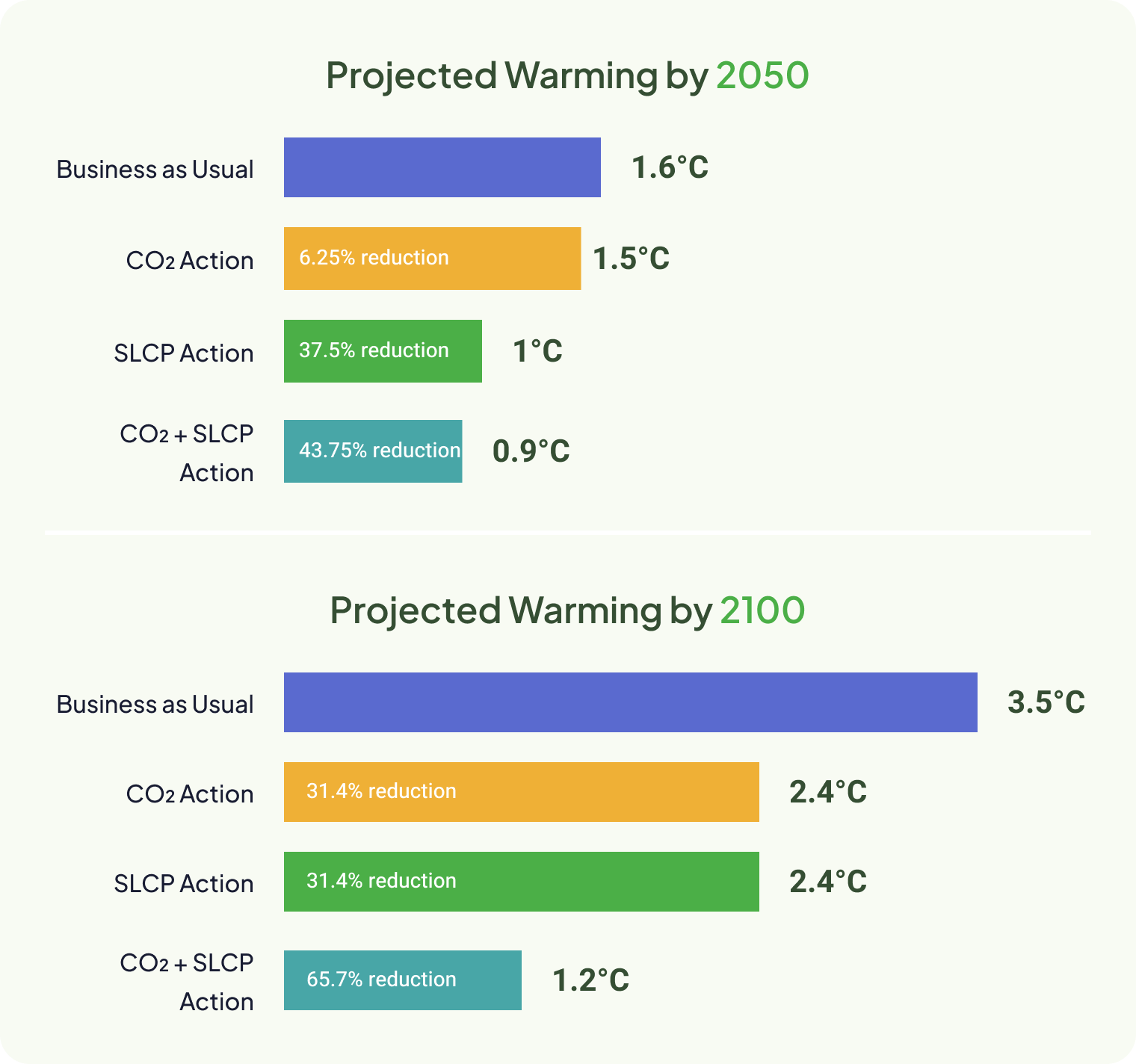In a business-as-usual (BAU) scenario, global temperatures could rise by 1.6 °C by 2050 and reach 3.5 °C by 2100. Cutting carbon dioxide (CO₂) emissions can reduce this warming by about 0.1 °C by 2050 and by 1.1 °C by 2100. Reducing only short-lived climate pollutants (SLCPs) like methane and black carbon can lower warming by around 0.6 °C by 2050 and 1.1 °C by 2100. This highlights the importance of SLCP mitigation in the short term, while CO₂ reduction is critical in the long term to limit warming to below 2 °C.